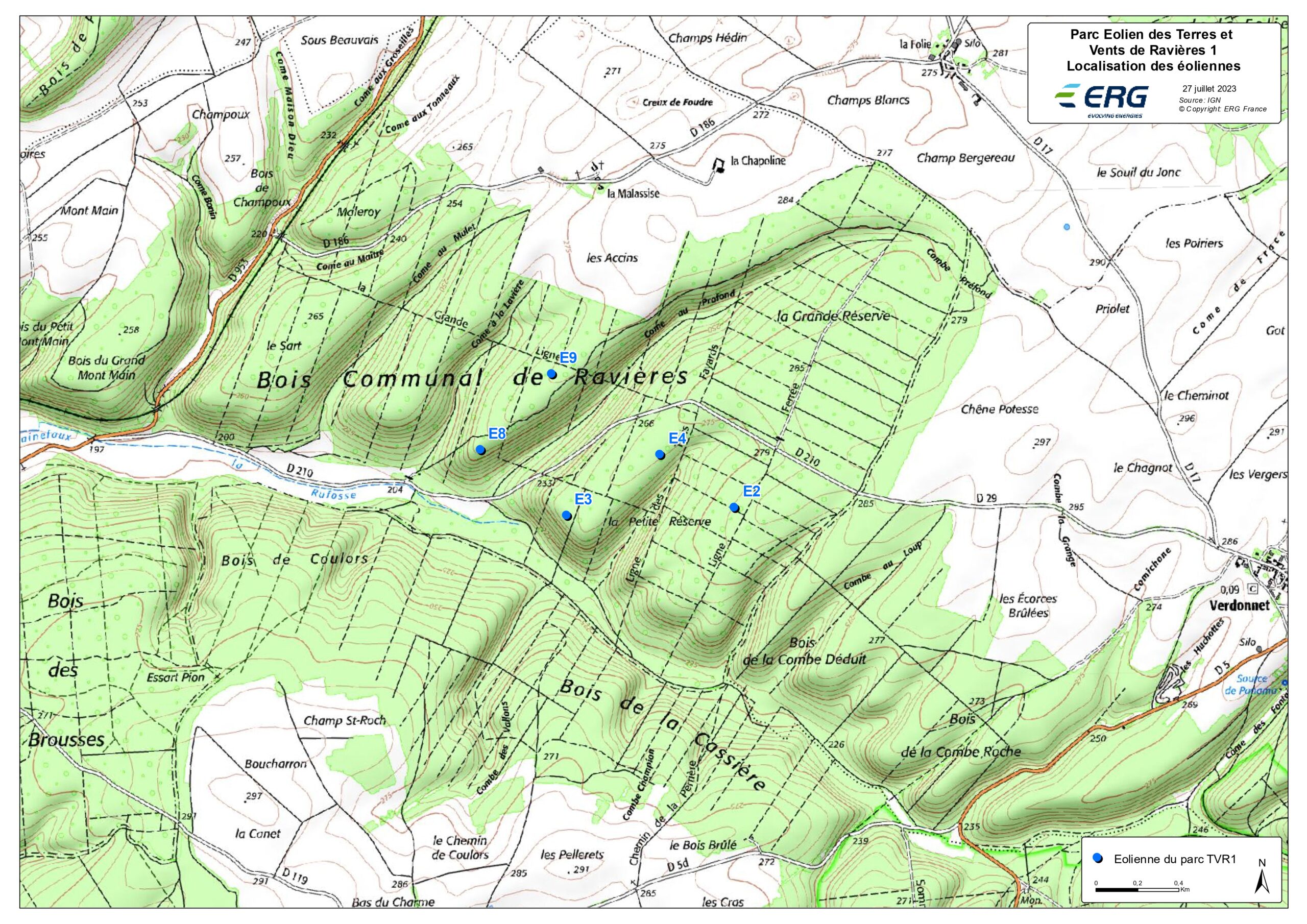 Après révision des autres parties du projet éolien des Terres et Vents de Ravières avec l’Armée, ERG a été décidé de ne pas poursuivre leurs développements afin de préserver les Secteurs d’Entrainement Très Basse Altitude (SETBA) utilisées par l’Armée de l’Air.